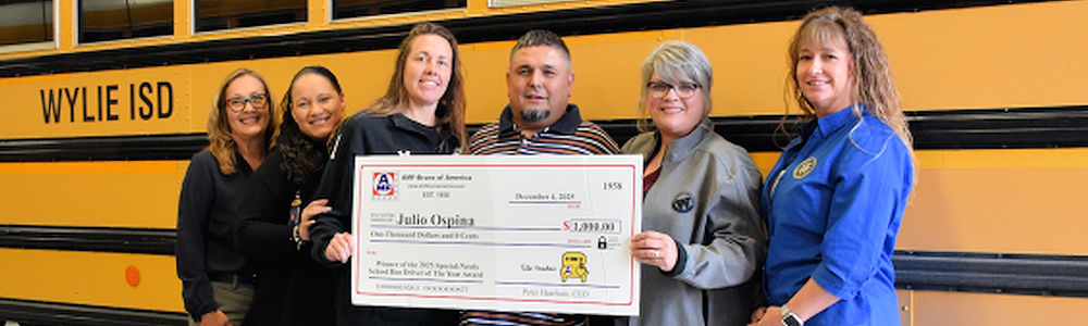 Julio Ospina holds a check for $1,000 after being named the AMF-Bruns Special Needs Driver of Year. From left to right, he stands with Martiza Valentin of AMF (far left) and his wife Liz Ospina, assistant director of transportation at Mesquite ISD, next to her. Jessie Murphy, director of Transportation Wylie ISD and Stephanie Meeks, assistant Director of transportation at Wylie stand on either side of Ospina with Christie Hebert, Texas state director at the far right. Photo via School Transportation News |